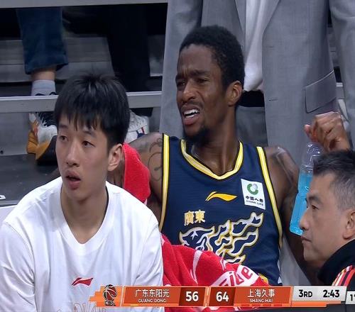 张皓嘉和古德温互相推搡,各有倒地,张皓嘉领到技术犯规。上半场广东队30比51落后。萨姆纳已经16分5篮板;客队张镇麟命中五记三分得到15分,白边16分8篮板,洛夫顿10分。